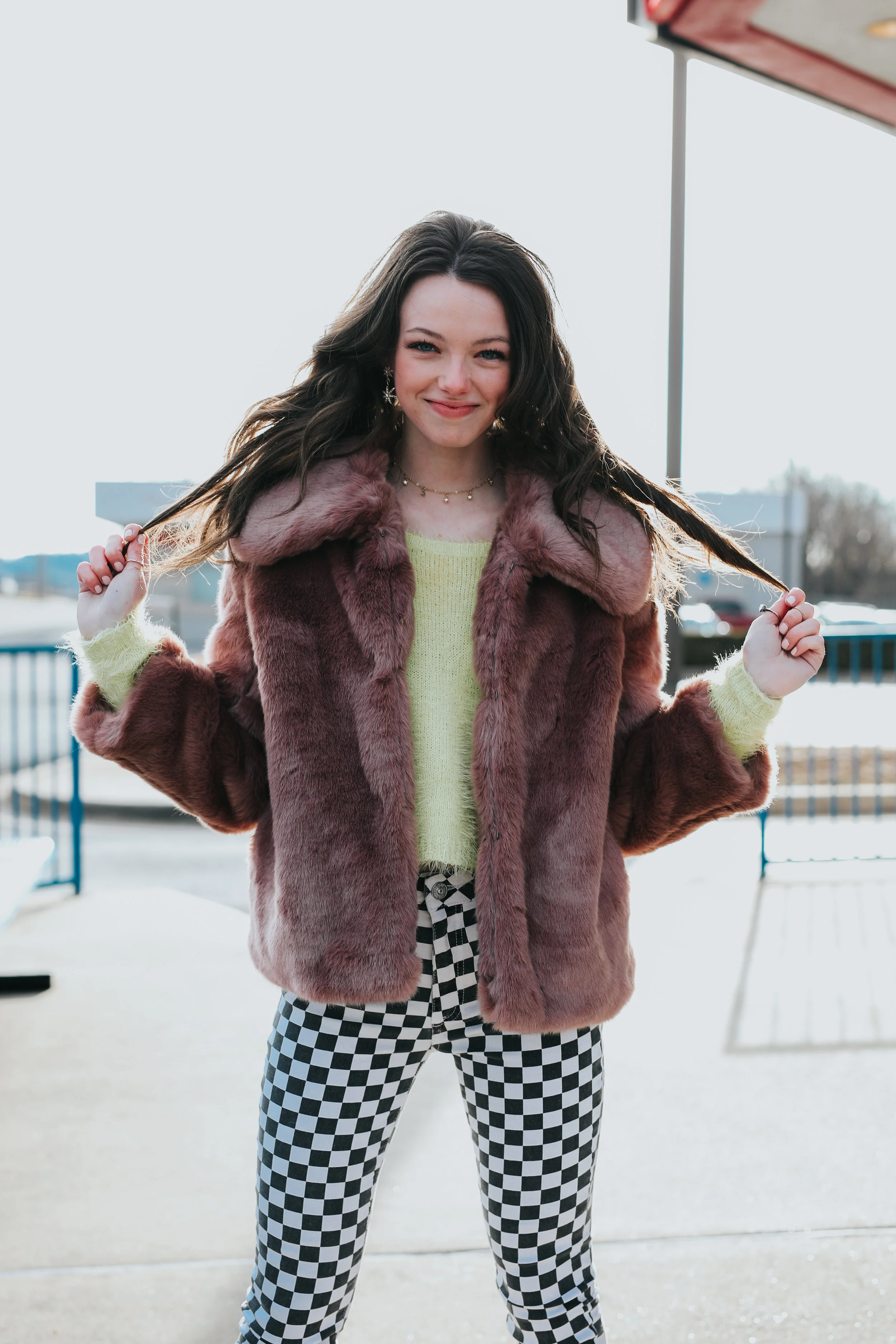 My outfit is my pink fur Target coat, cropped yellow fuzzy sweater (an oldie from Hollister / Marshalls), BDG black and white checkered pants from Urban Outfitters, Sugar Fix by Bauble Bar star earrings, star choker, and Fenty x Puma 'Creepers' platform tennis shoes.