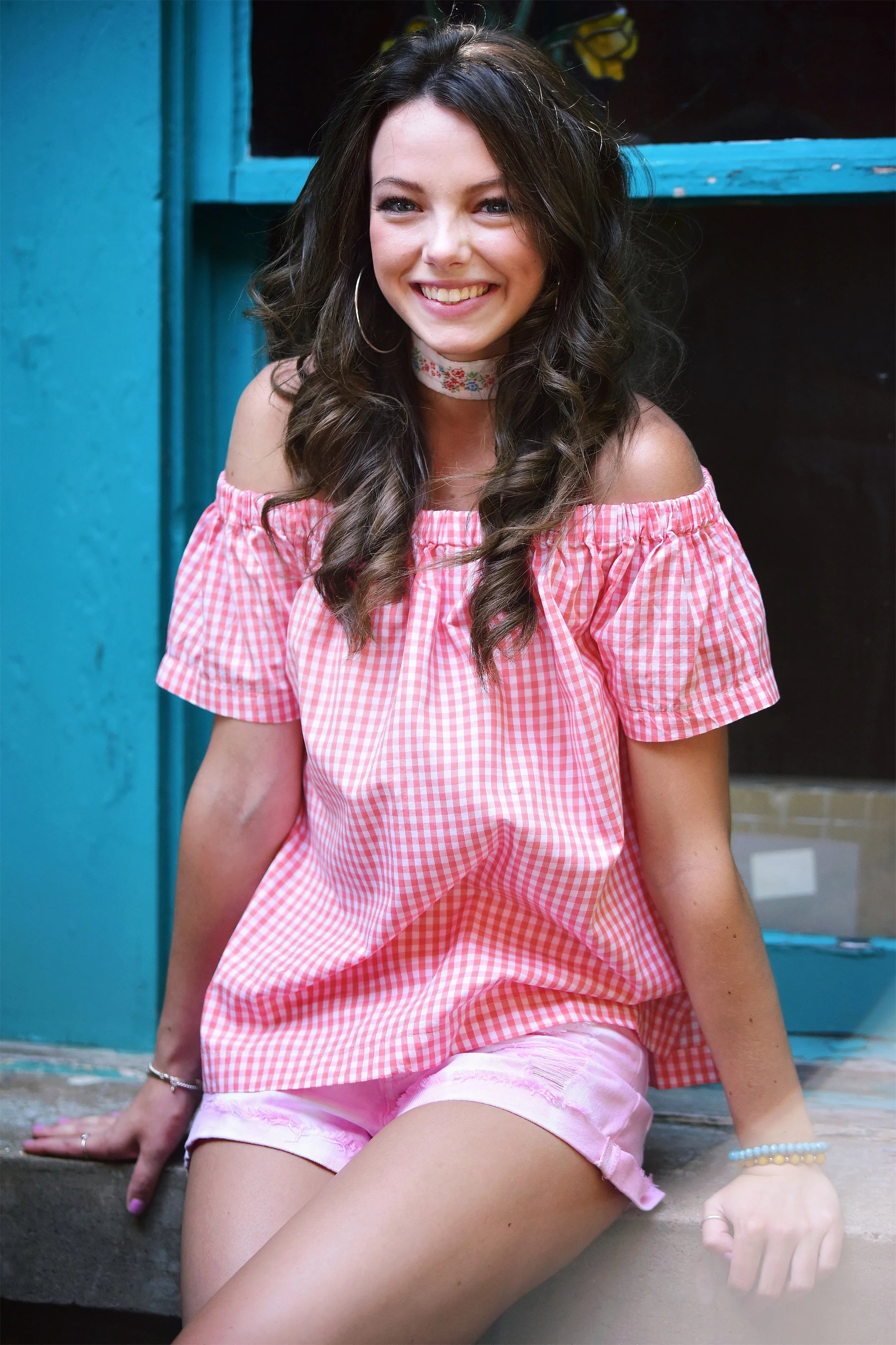 Orange Gingham off-the-shoulder shirt $16.99, Knotted & Striped Romper $14.99, Rose Appliqué Wallet $7.99, White Floral off-the-shoulder top $12.99, Seersucker-striped Appliqué Romper $14.99, and lastly the Red Floral Cinched top $12.99.